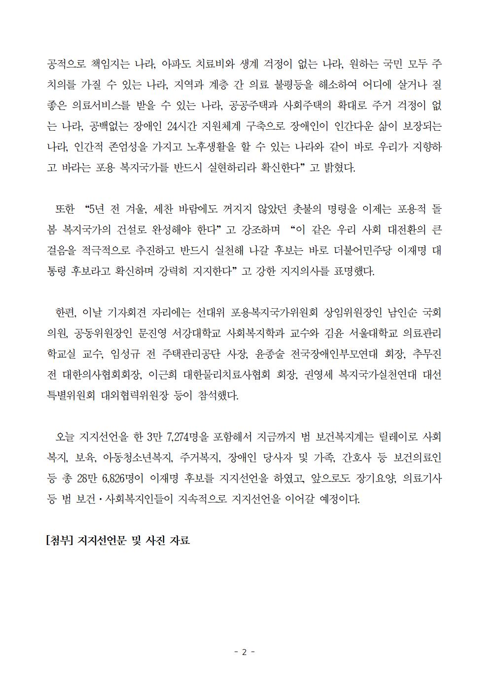 [보도자료] 더불어민주당 선대위 포용복지국가위원회 범 보건복지인 이재명 후보 지지선언