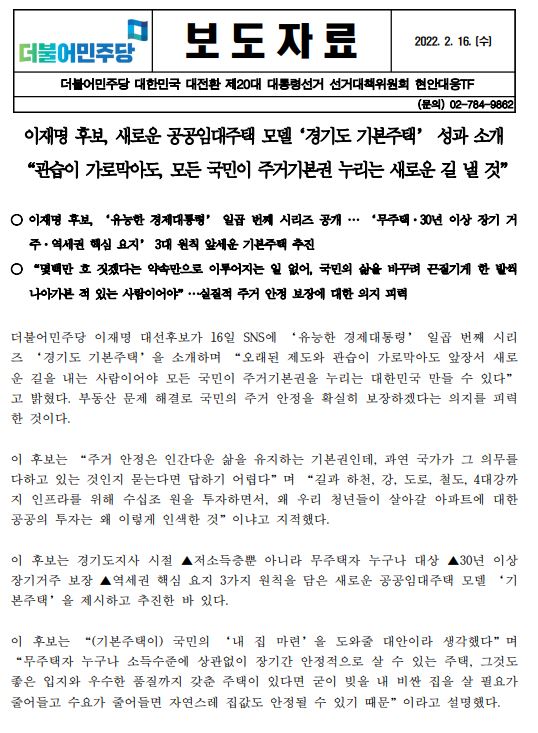 [보도자료] 더불어민주당 선대위 현안대응TF, 이재명 후보 '유능한 경제대통령' 일곱 번째 시리즈, '경기도 기본주택' 성과 소개