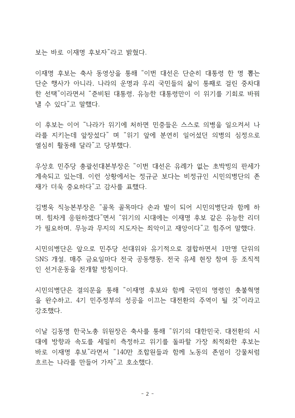 [보도자료] 더불어민주당 선대위 직능본부, 들불 시민의병단 출범 및 촛불시민 20만 명 서명운동 전개