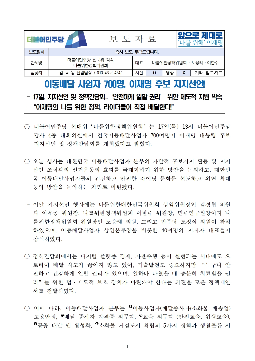 [보도자료] 더불어민주당 선대위 나를위한정책위원회, 이동배달 사업자 700명 후보 지지선언