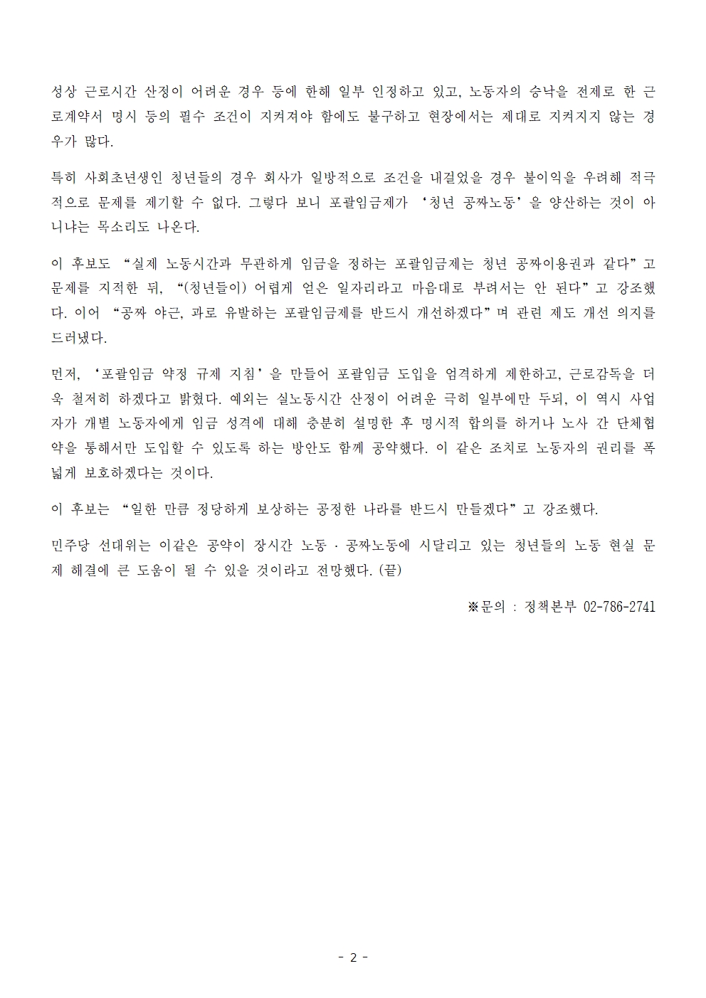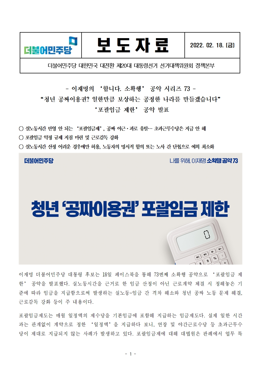 [보도자료] 더불어민주당 선대위 정책본부, '이재명은 합니다. 소확행 공약 시리즈 73' 포괄임금 제한 공약 발표