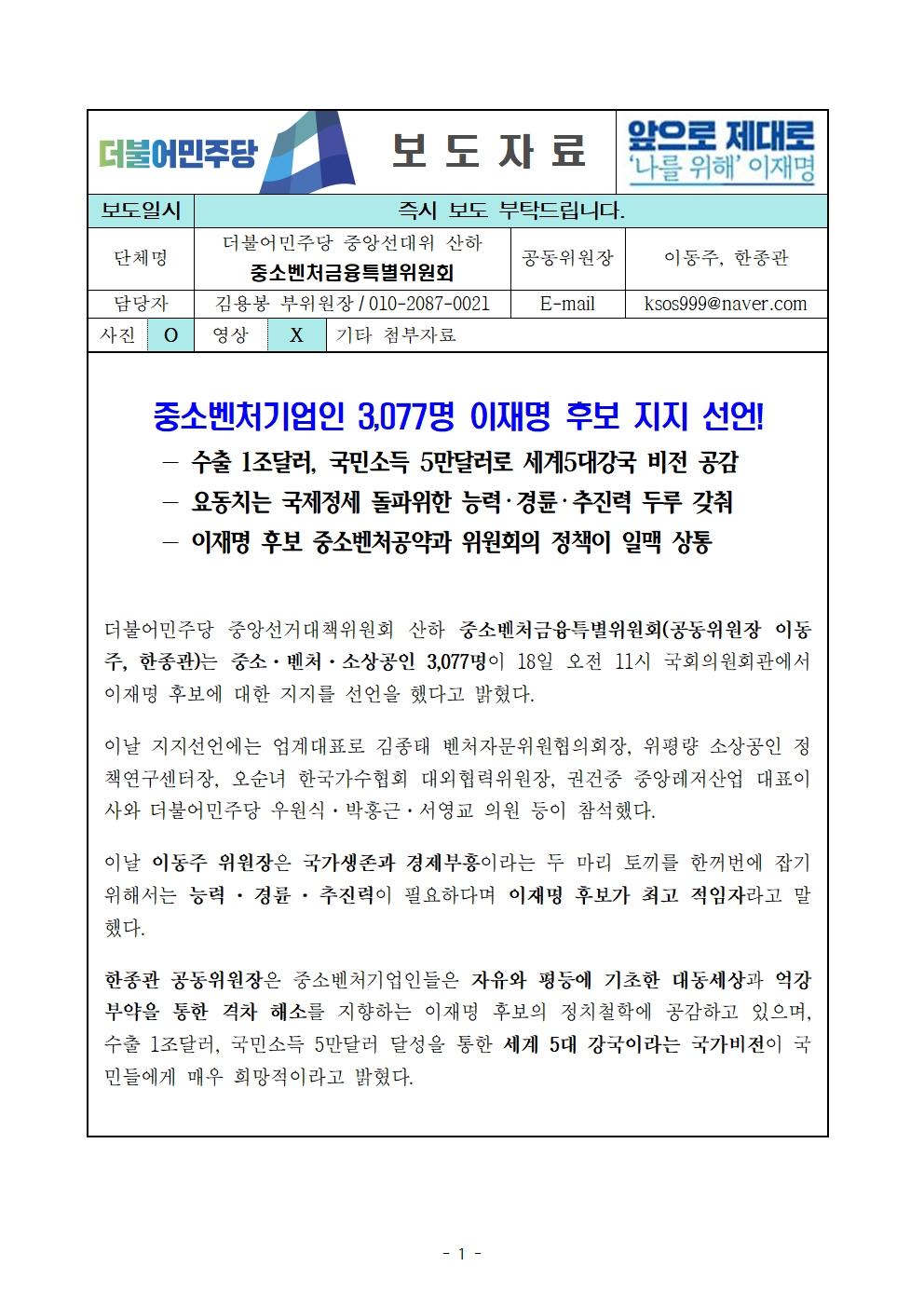 [보도자료] 더불어민주당 선대위 중소벤처금융특별위원회, 중소벤처기업인 3,077명 후보 지지선언