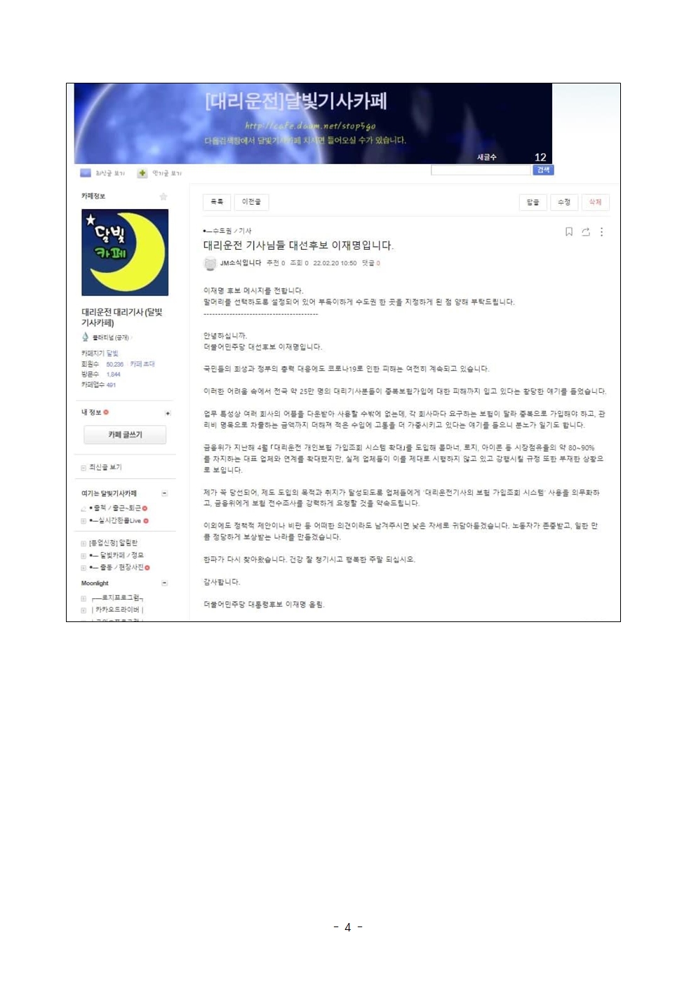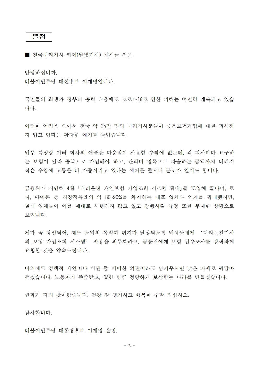 [보도자료] 더불어민주당 선대위 온라인소통단, 후보 대리운전기사 온라인 커뮤니티 직접 찾아 정책 소통