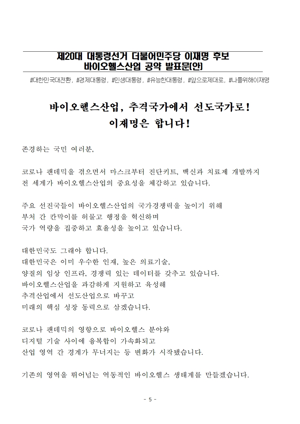 [보도자료] 더불어민주당 선대위 정책본부, 바이오헬스산업 5대 공약 발표