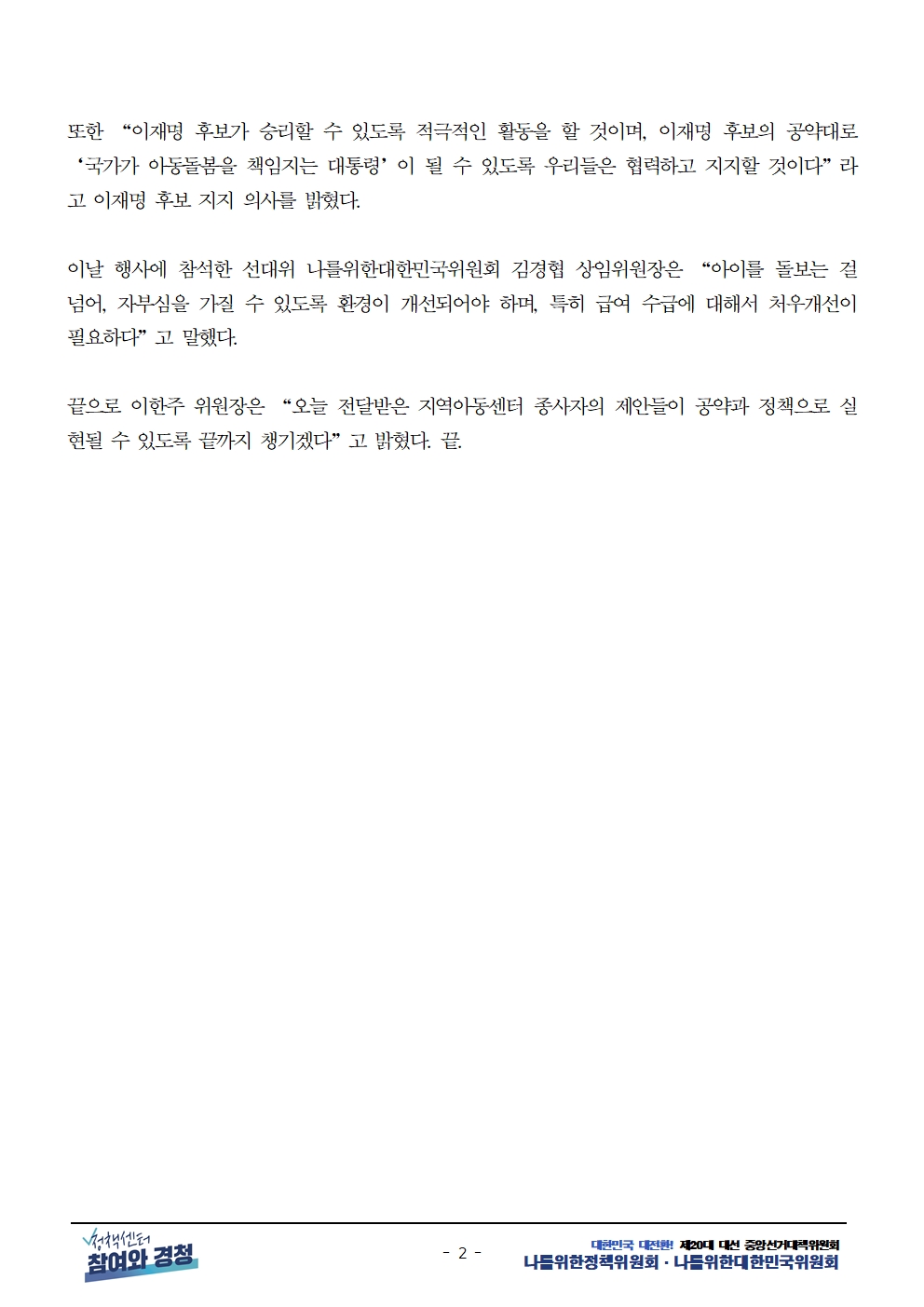 [보도자료] 더불어민주당 선대위 나를위한정책위원회·나를위한대한민국위원회, 아동이 행복한 사회를 만들기 위한 '지역아동센터 종사자 1만명' 후보 지지선언