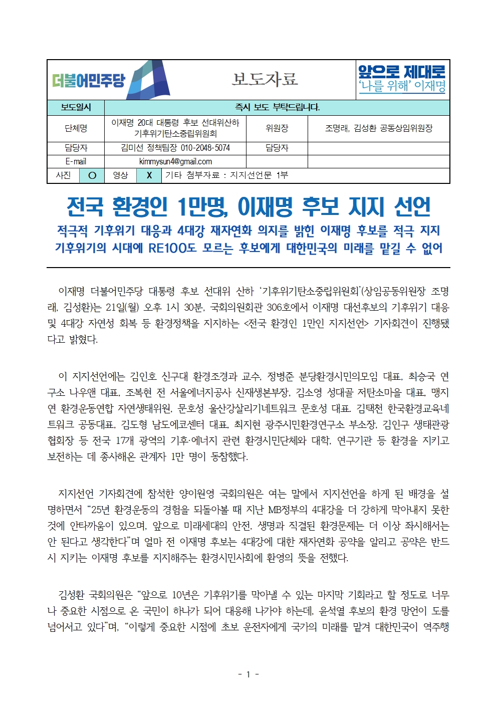 [보도자료] 더불어민주당 선대위 기후위기탄소중립위원회, 전국 환경인 1만 명, 후보 지지선언