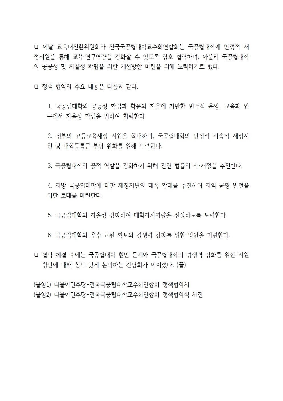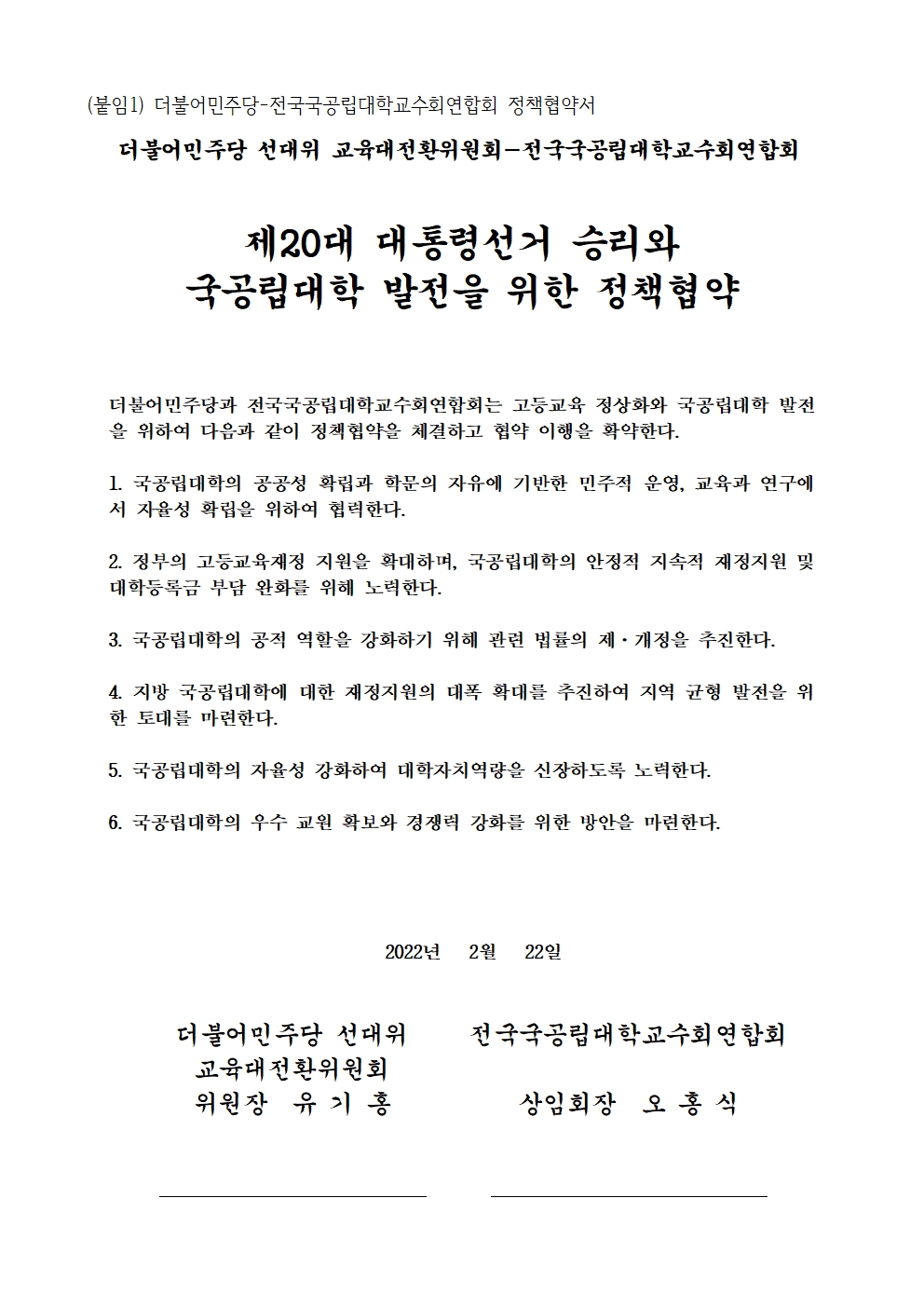 [보도자료] 더불어민주당 선대위 교육대전환위원회·전국국공립대학교수회연합회, 국공립대학 발전을 위한 정책협약식 개최