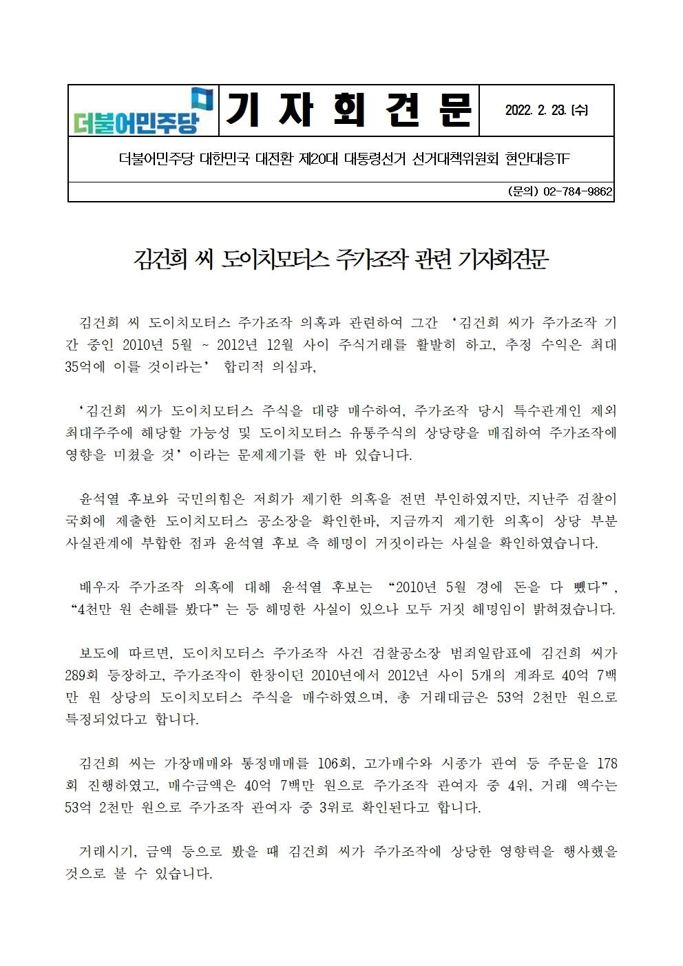 [기자회견문] 더불어민주당 선대위 현안대응TF, 김건희 씨 도이치모터스 주가 조작 관련 기자회견문
