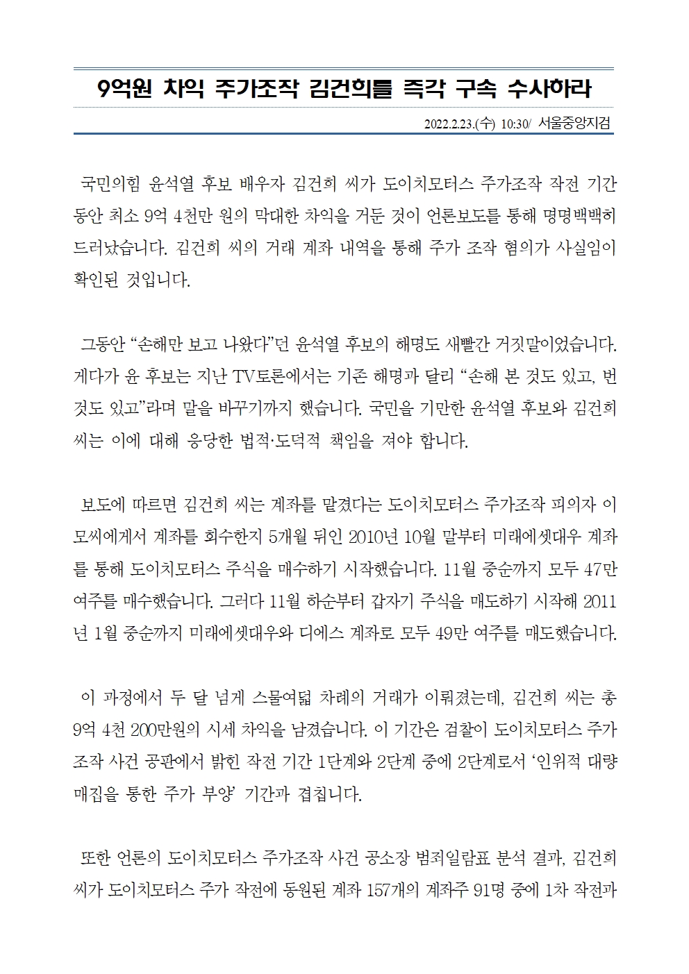 [기자회견문] 김건희씨 주가조작 진상규명을 위한 검찰 수사촉구, 9억원 차익 주가조작 김건희를 즉각 구속 수사하라