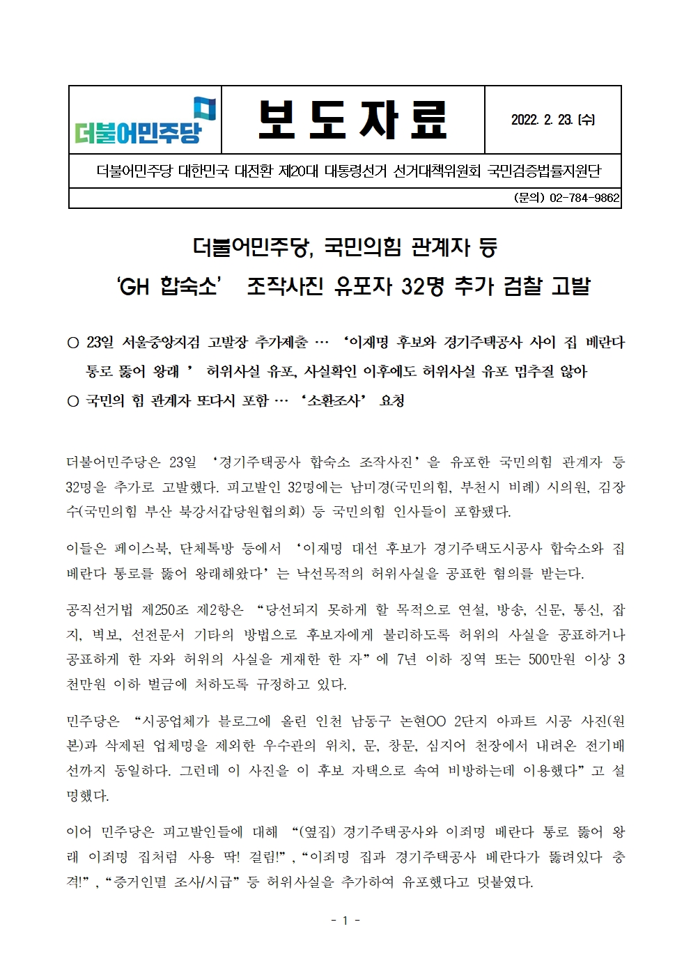 [보도자료] 더불어민주당 선대위 국민검증법률지원단, 국민의힘 관계자 등 'GH 합숙소' 조작사진 유포자 32명 추가 검찰 고발