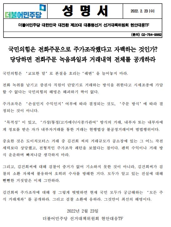 [성명서] (더불어민주당 선대위 현안대응TF) 국민의힘은 전화주문하고 주가조작했다고 자백하는 것인가? 당당하면 전화주문 녹음파일과 거래내역 전체를 공개하라