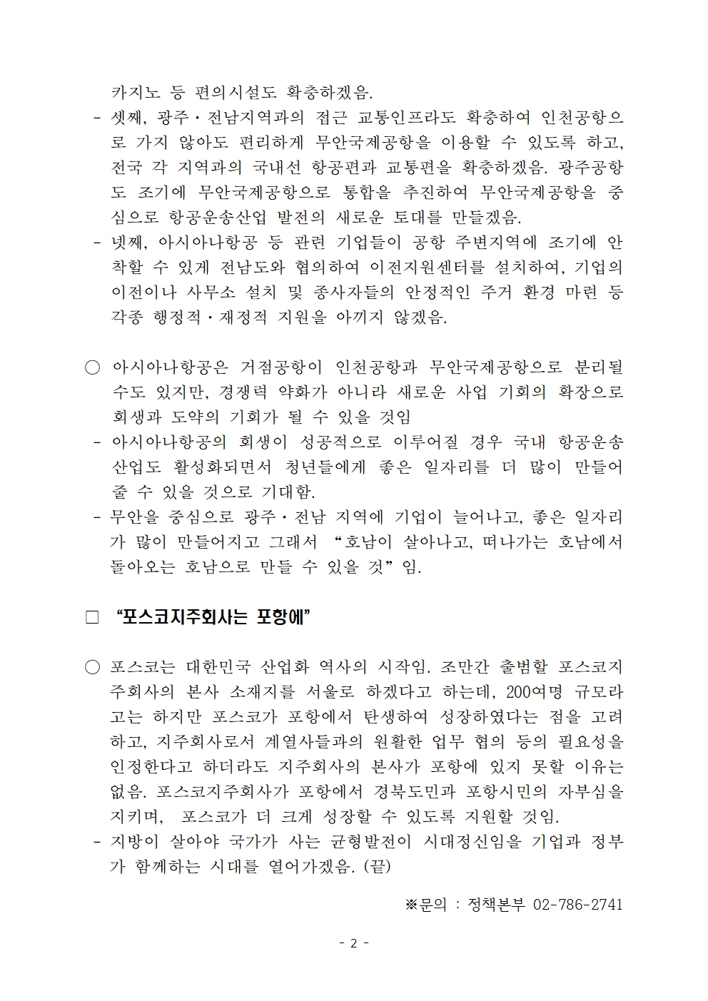 [보도자료] 더불어민주당 선대위 정책본부, '아시아나 거점공항은 무안 국제공항으로, 포스코지주회사는 포항에' 발표