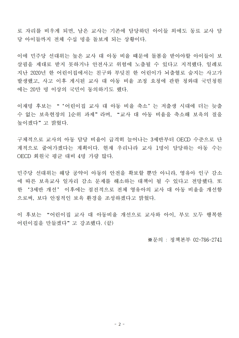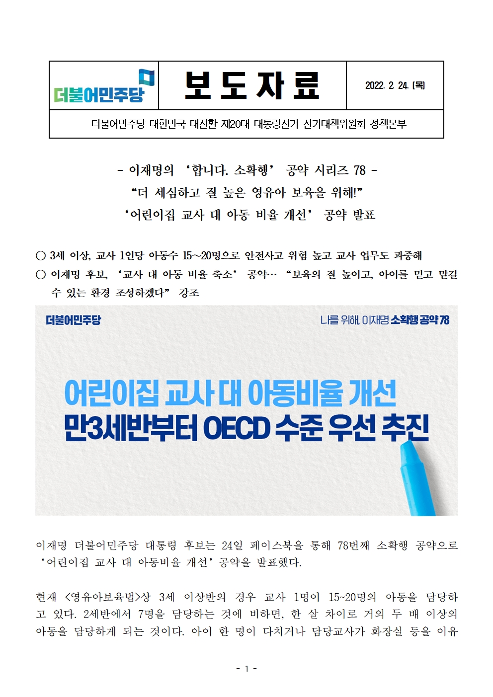 [보도자료] 더불어민주당 선대위 정책본부, '이재명은 합니다. 소확행 공약 시리즈 78' 어린이집 교사 대 아동 비율 개선 공약 발표