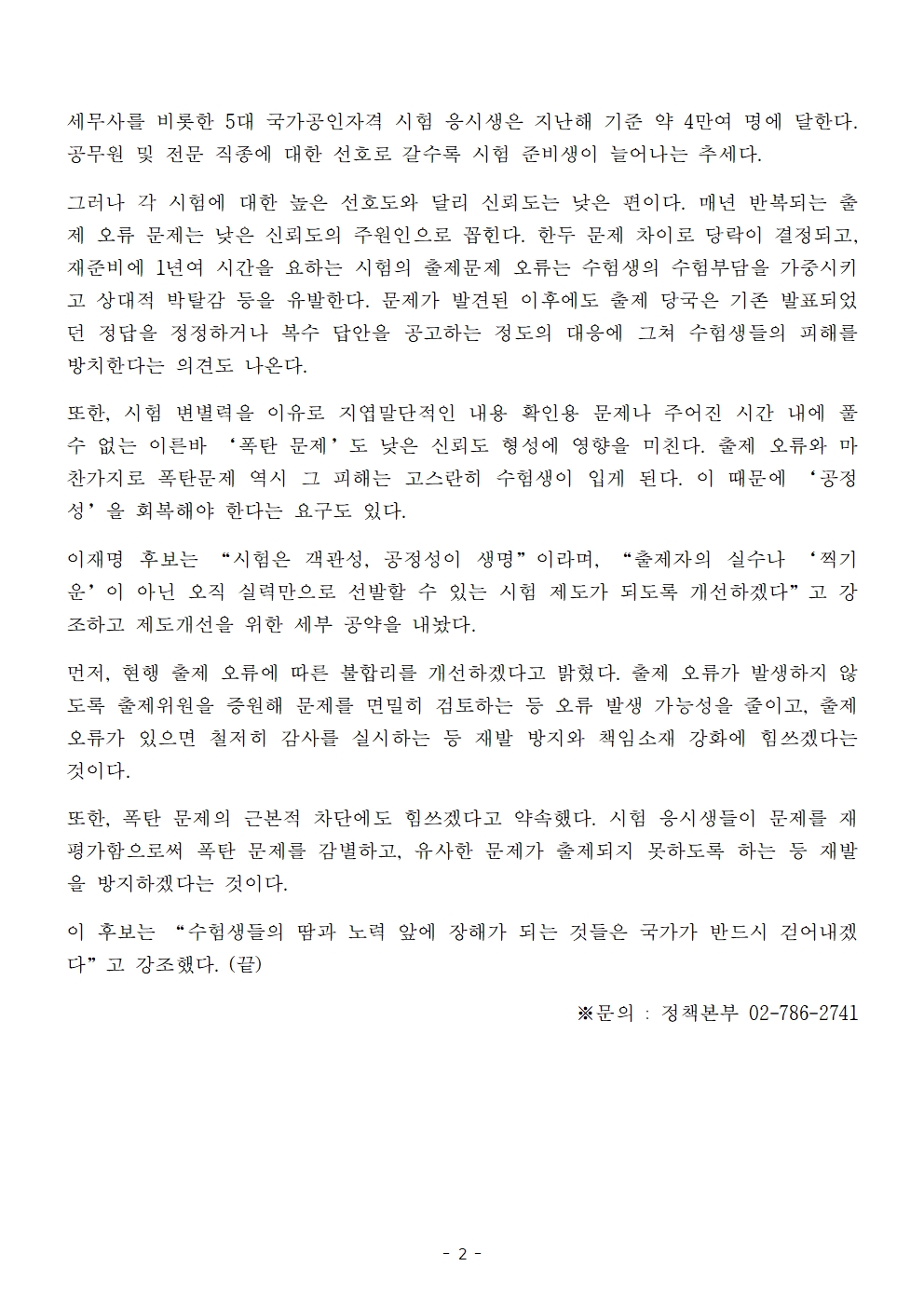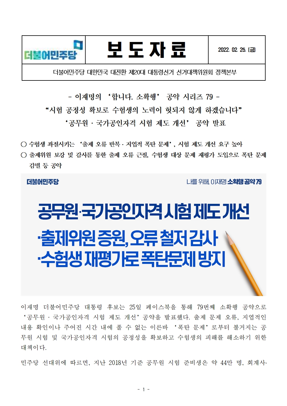 [보도자료] 더불어민주당 선대위 정책본부, '이재명은 합니다. 소확행 공약 시리즈 79' 공무원·국가공인자격 시험 제도 개선 공약 발표