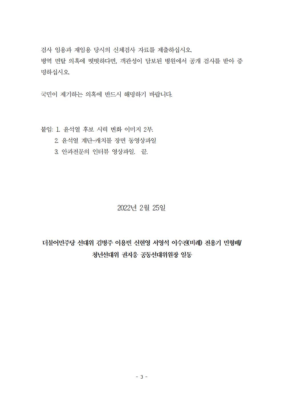 [기자회견문] 더불어민주당 선대위 윤석열 후보 부동시 병역기피 의혹 관련 기자회견
