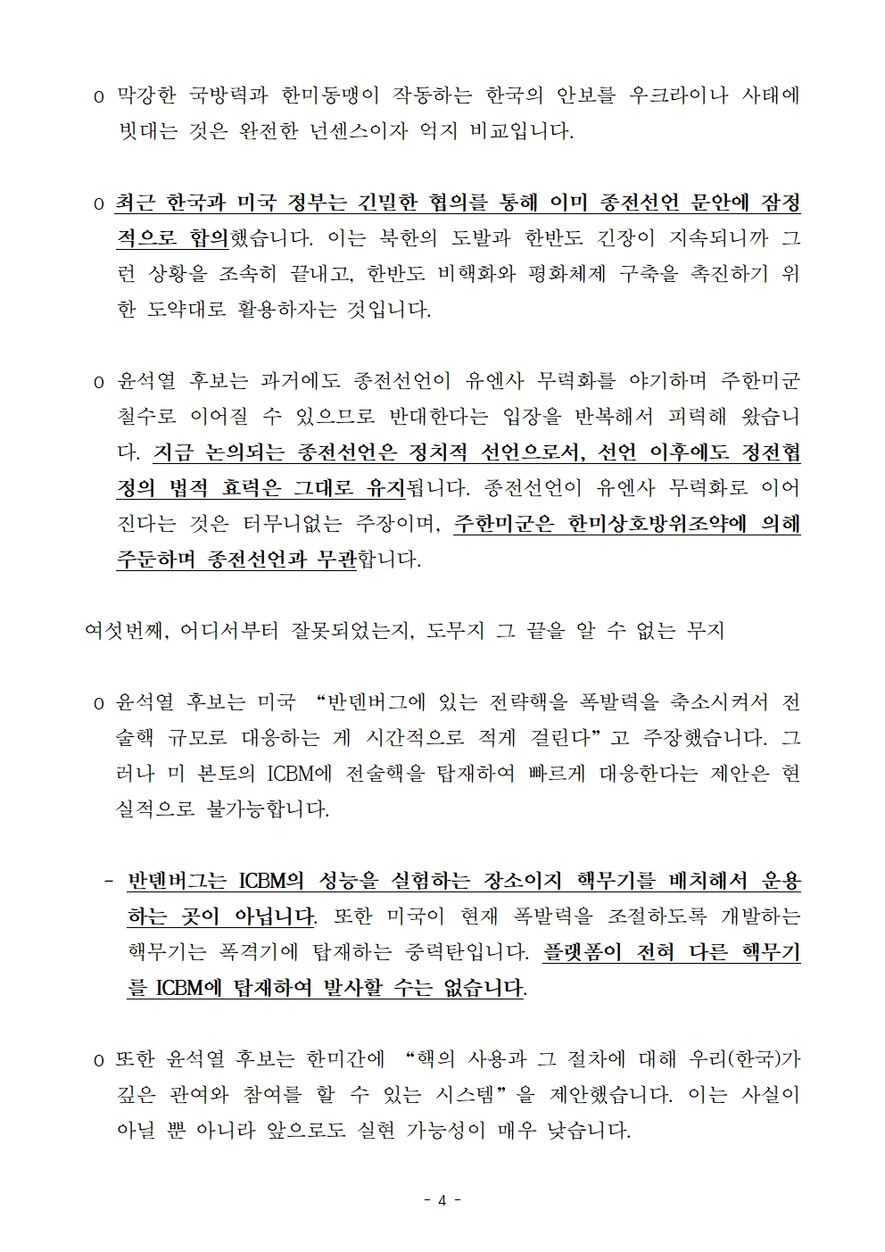 [논평] 더불어민주당 선대위 평화번영위원회, ‘위험천만’ 윤석열 후보의 TV 토론 중 말 바꾸기·허위사실·왜곡 발언·안보 무지에 대한 팩트체크