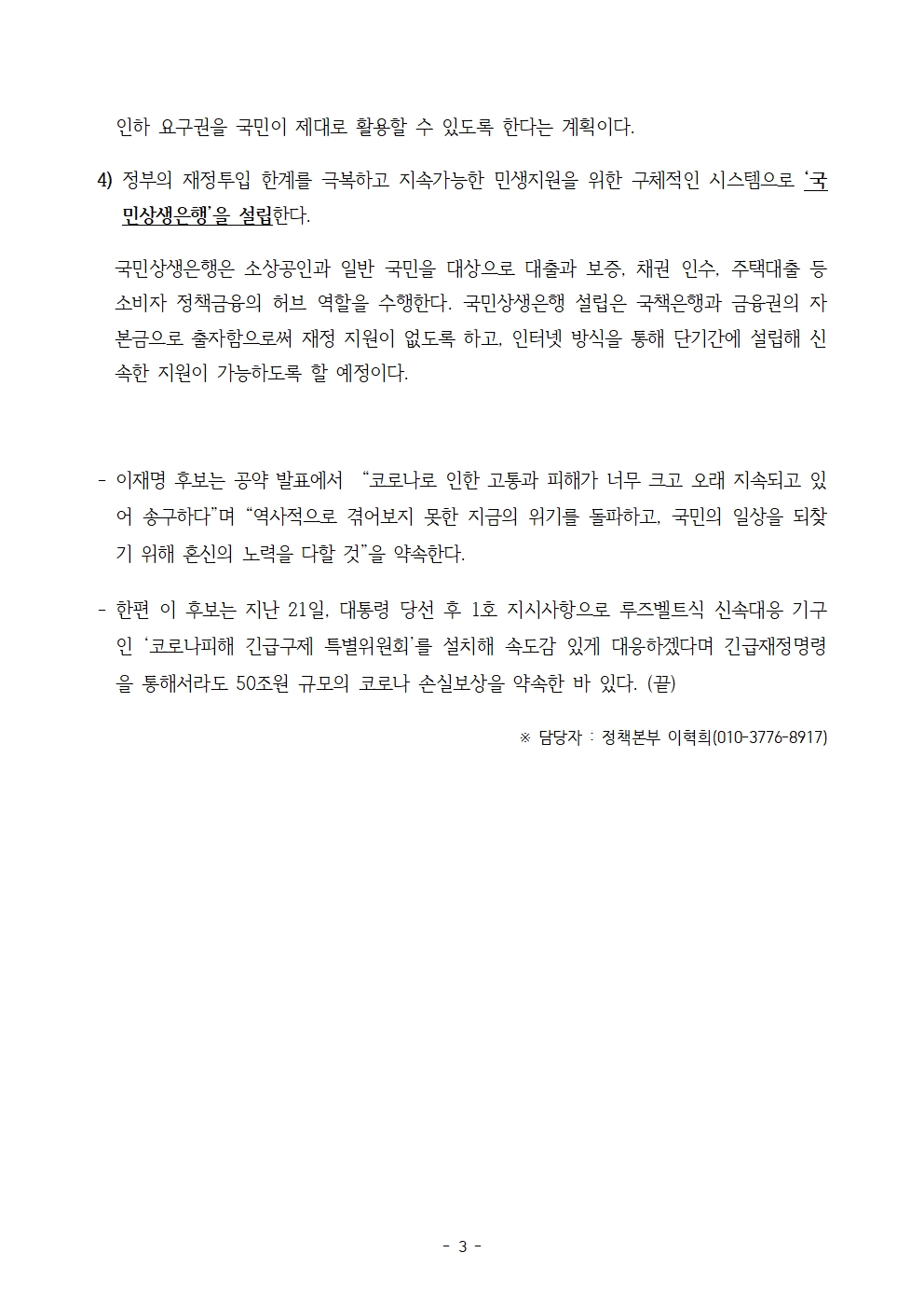 [보도자료] 더불어민주당 선대위 정책본부, 코로나19 극복 ‘긴급 금융구제 지원책’ 발표