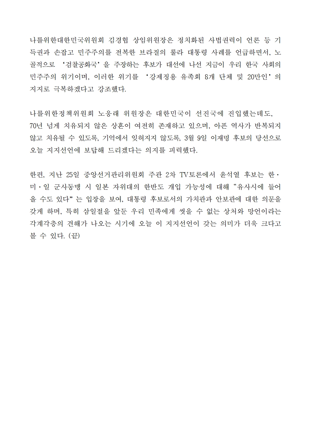 [보도자료] 더불어민주당 선대위 나를위한정책위원회, 강제징용 유족회 8개 단체 후보 지지선언