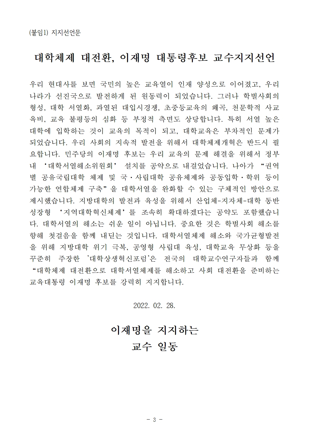 [보도자료] 더불어민주당 선대위 교육대전환위원회, '대학상생혁신포럼' 101개 대학 교수 300명, 후보 대학체제 대전환 지지선언