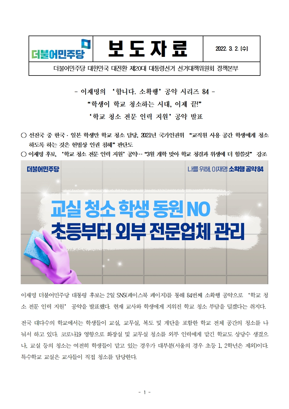[보도자료] 더불어민주당 선대위 정책본부, '이재명은 합니다. 소확행 공약 시리즈 84' 학교 청소 전문 인력 지원 공약 발표
