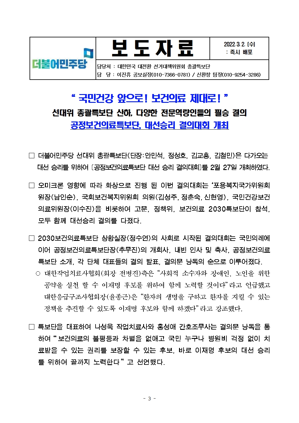 [보도자료] 더불어민주당 선대위 총괄특보단, 문화업계 종사자 후보 지지선언 및 공정보건의료특보단 결의대회 개최