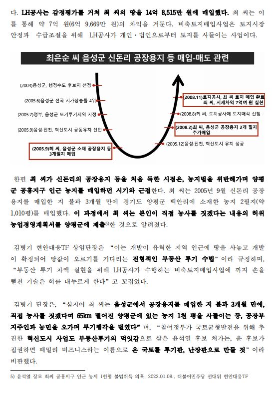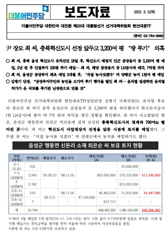 [보도자료] (더불어민주당 선대위 현안대응TF) 尹 장모 최 씨, 충북혁신도시 선정 앞두고 3,200여 평 '땅 투기' 의혹