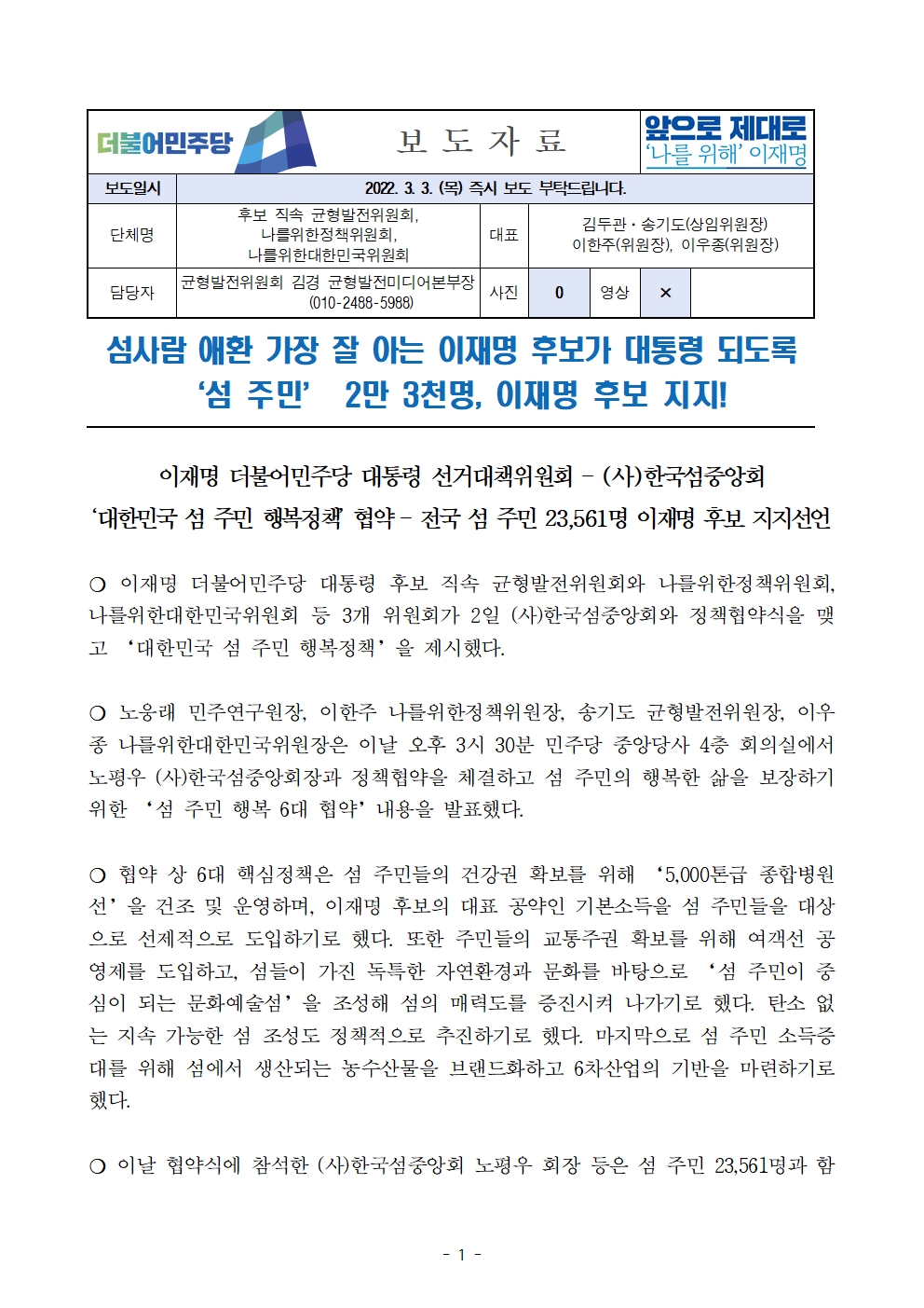 [보도자료] 더불어민주당 선대위 균형발전위원회·나를위한정책위원회·나를위한대한민국위원회, (사)한국섬중앙회 후보 지지선언 및 정책협약 체결