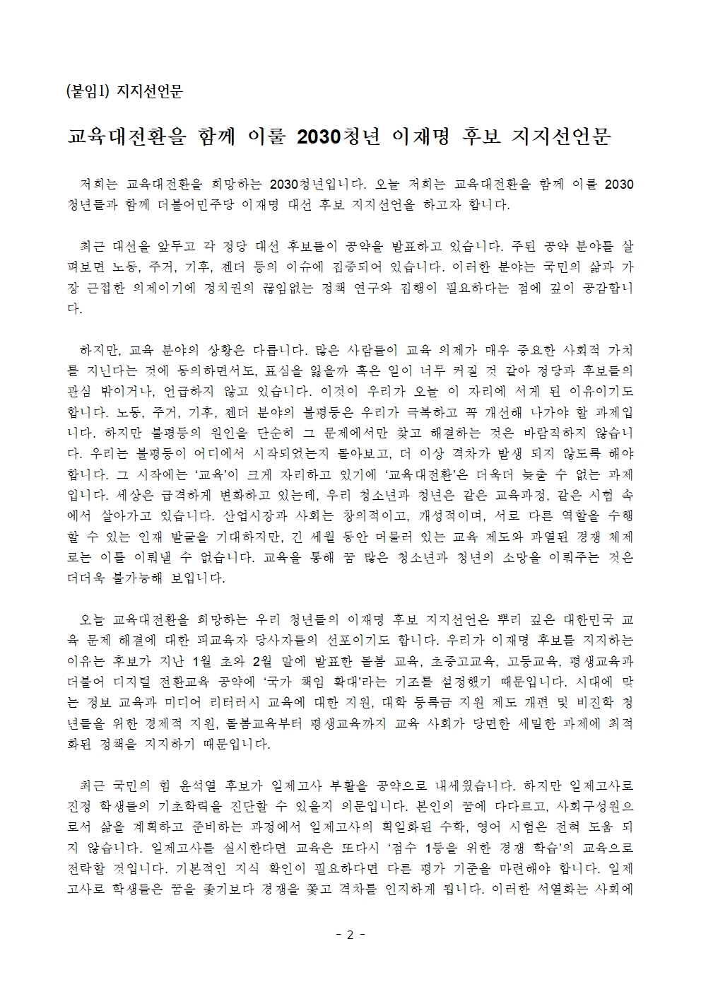 [보도자료] 더불어민주당 선대위 교육대전환위원회, 교육대전환 정책 지지 2030청년 123명 후보 지지선언