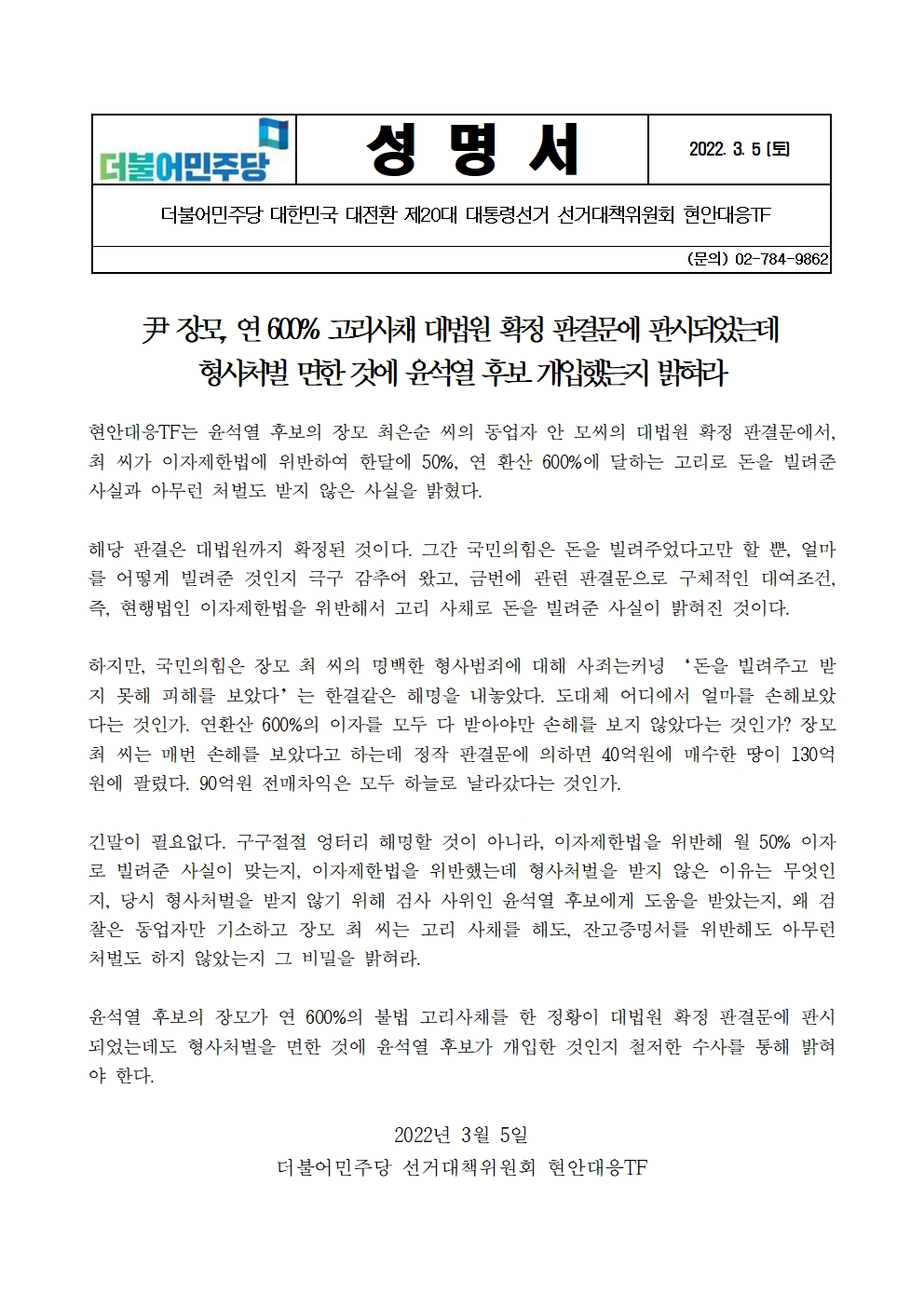 [성명서] 더불어민주당 선대위 현안대응TF, 尹 장모, 연 600% 고리사채 대법원 확정 판결문에 판시되었는데 형사처벌 면한 것에 윤석열 후보 개입했는지 밝혀라