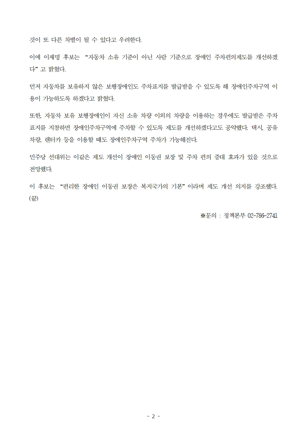 [보도자료] 더불어민주당 선대위 정책본부, '이재명은 합니다. 소확행 공약 시리즈 87' 장애인 주차 편의 제도 개선 공약 발표