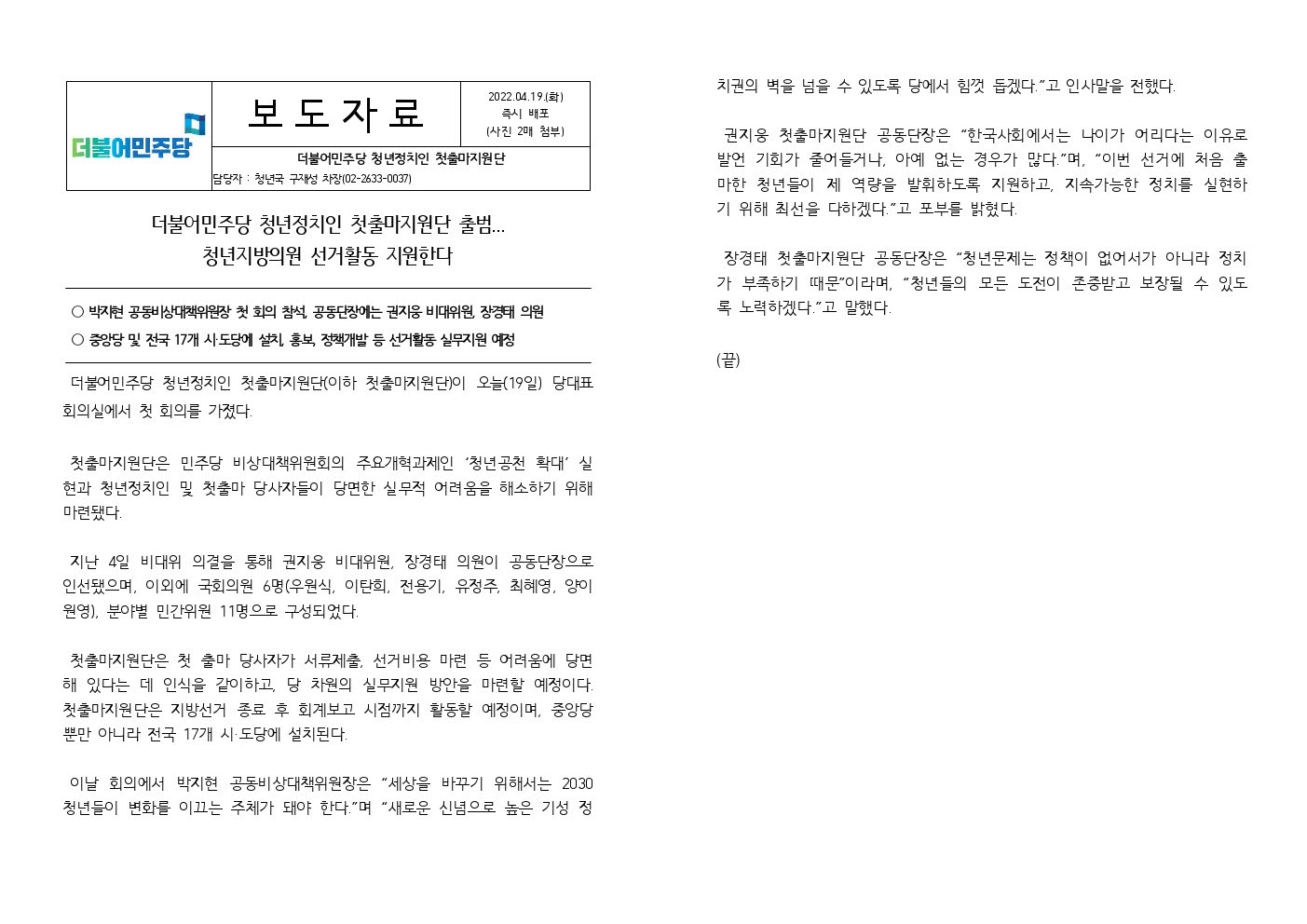 [보도자료] 더불어민주당 청년정치인 첫출마지원단 출범