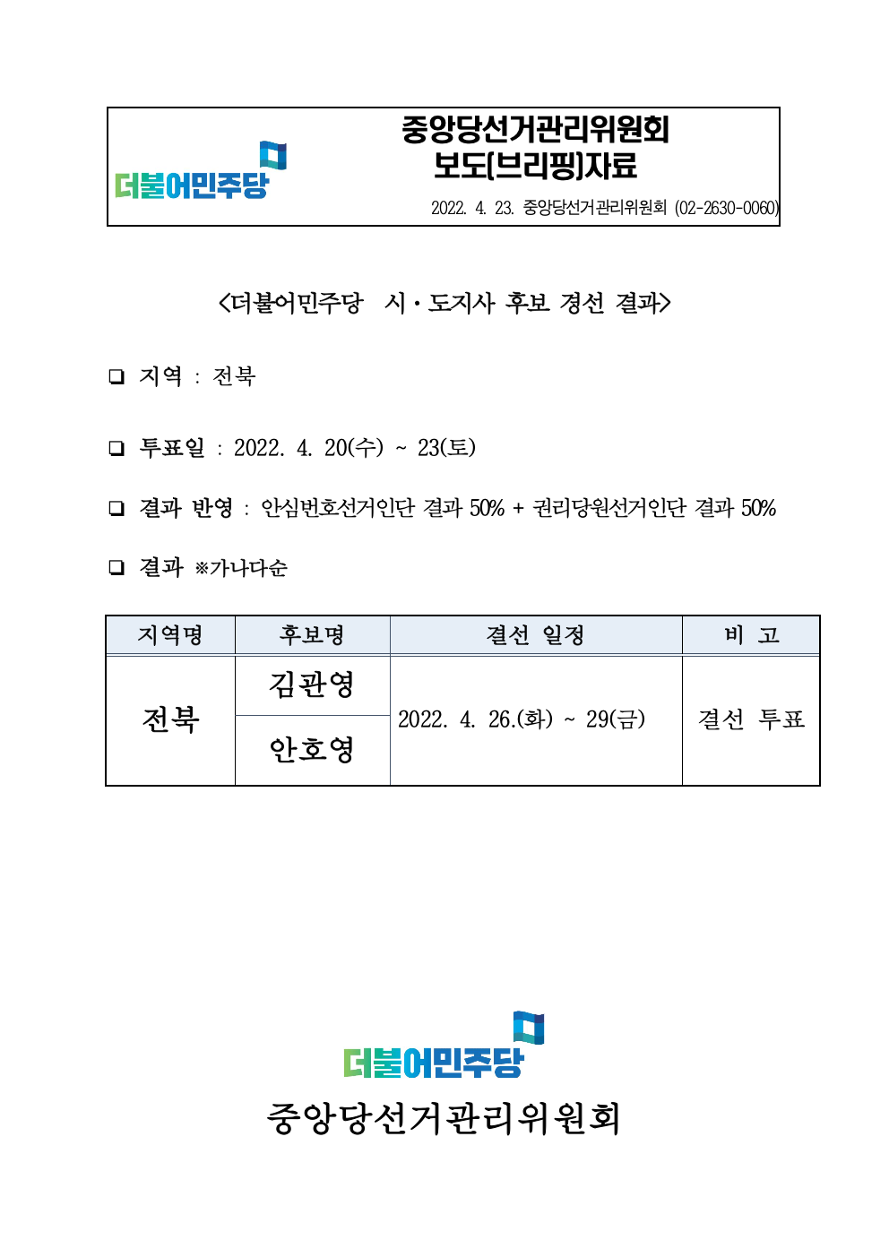 [보도자료] 더불어민주당 중앙당선거관리위원회, 더불어민주당 시도지사 후보 경선 결과