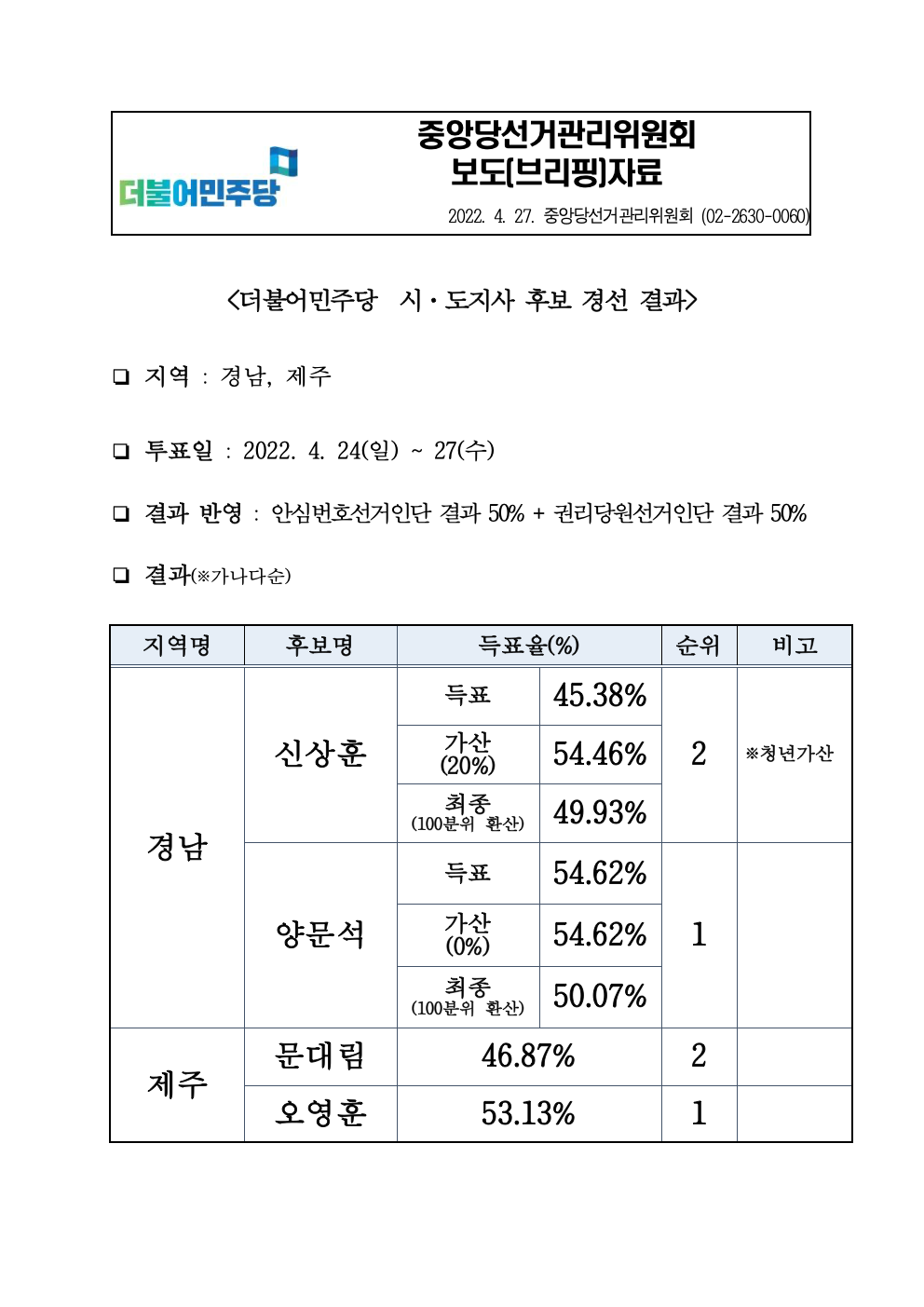 [보도자료]더불어민주당 경남·제주 시도지사 후보 경선 결과(수정)