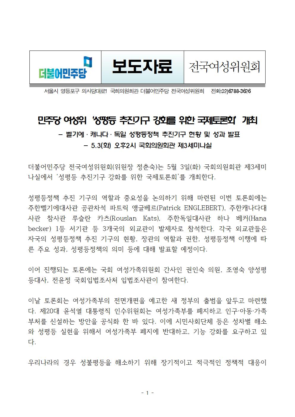 [보도자료] 더불어민주당 전국여성위원회, 성평등 추진기구 강화를 위한 국제토론회 개최