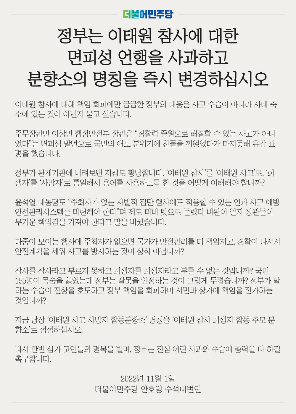 정부는 이태원 참사에 대한 면피성 언행을 사과하고 분향소의 명칭을 즉시 변경하십시오