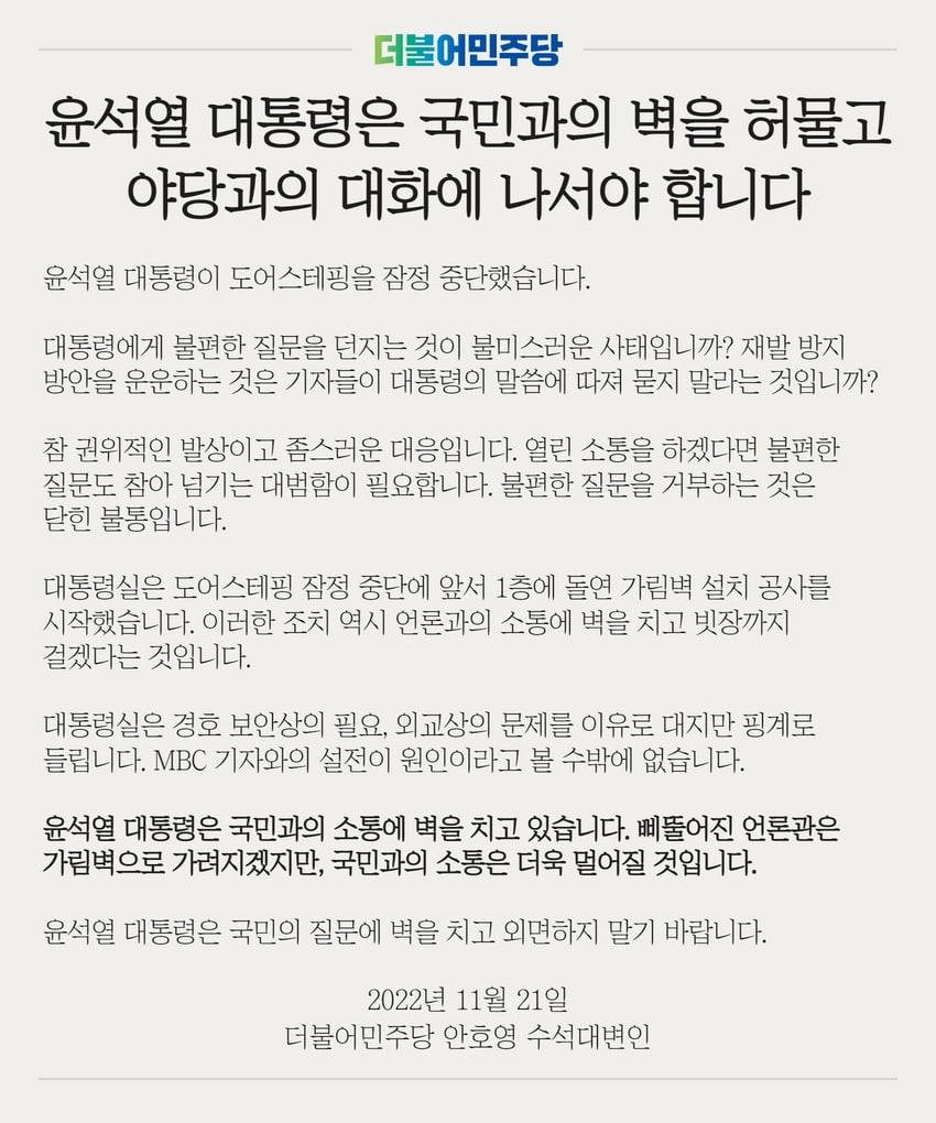 윤석열 대통령은 국민과의 벽을 허물고 야당과의 대화에 나서야 합니다