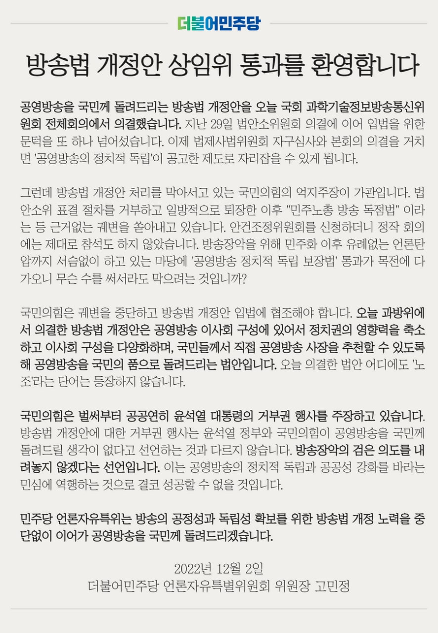 윤석열정권 공영방송 장악방지법! 2일 국회 과방위 통과