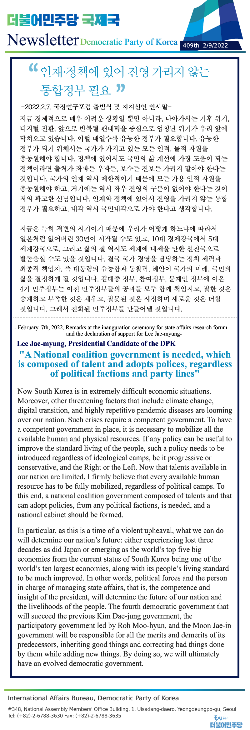 [408th Newsletter]Excerpt from Remarks by DPK’s Presidential Candidate Lee Jae-myung in Press Confer