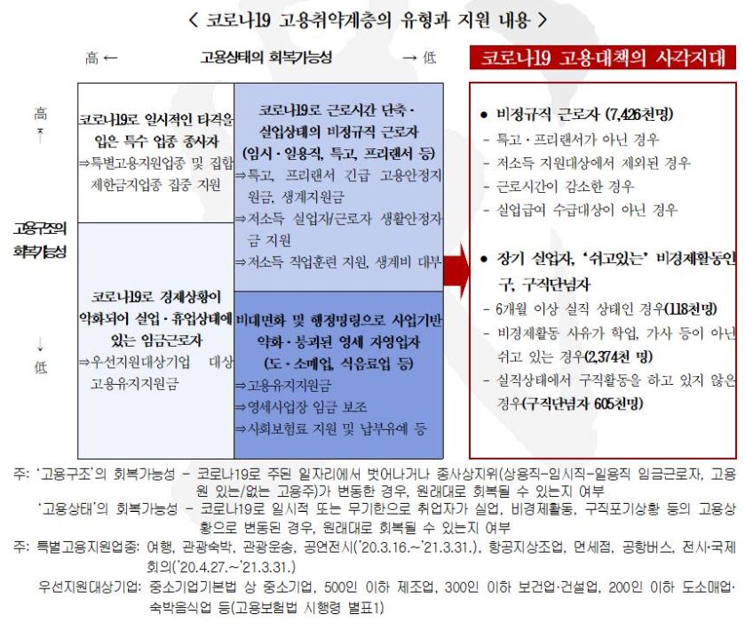 - 코로나19로 대부분의 일자리 기반이 크게 악화되었지만 지원은 일자리의 취약정도가 아니라