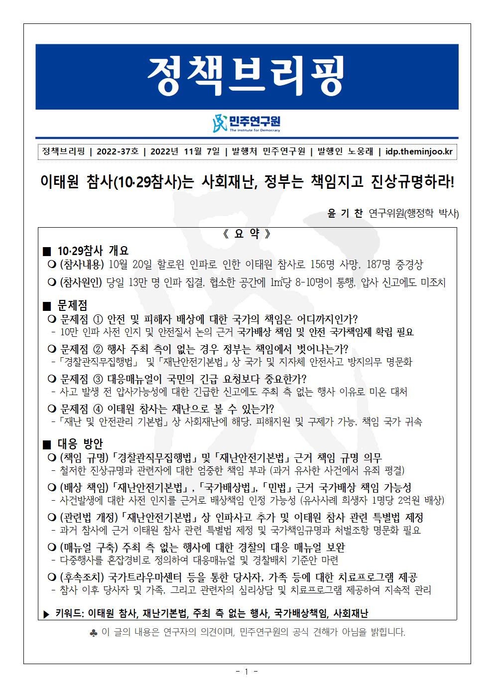 221107_민주연구원_정책브리핑_37호_이태원_참사(10∙29참사)는_사회재난,_정부는_책임지고_진상규명하라!_윤기찬.pdf