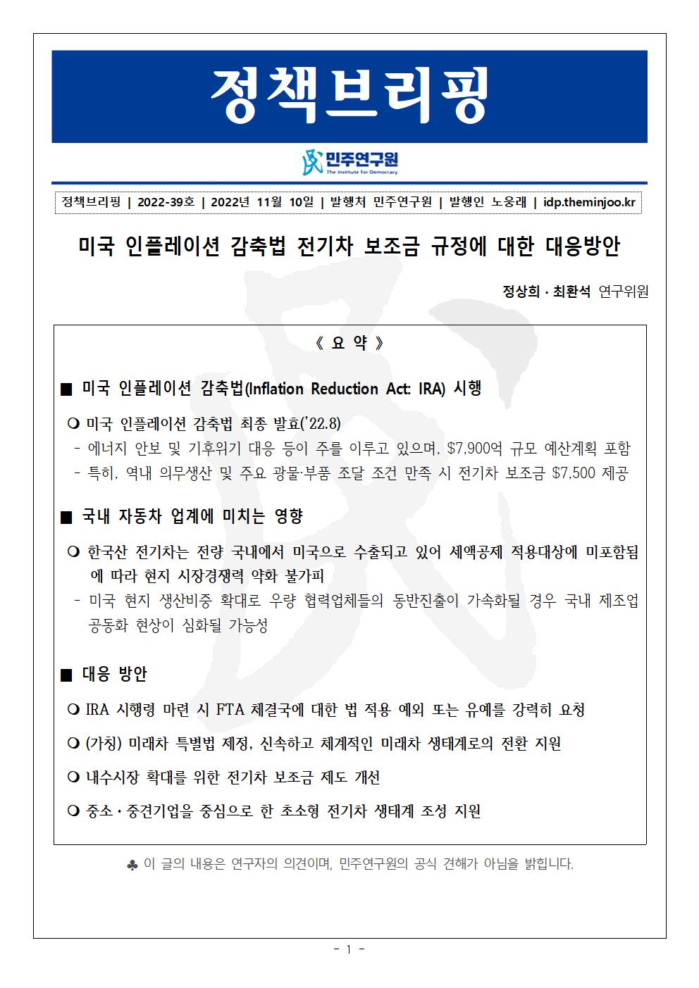 221110_민주연구원_정책브리핑_39호_미국_인플레이션_감축법_전기차_보조금_규정에_대한_대응방안_정상희_최환석.pdf