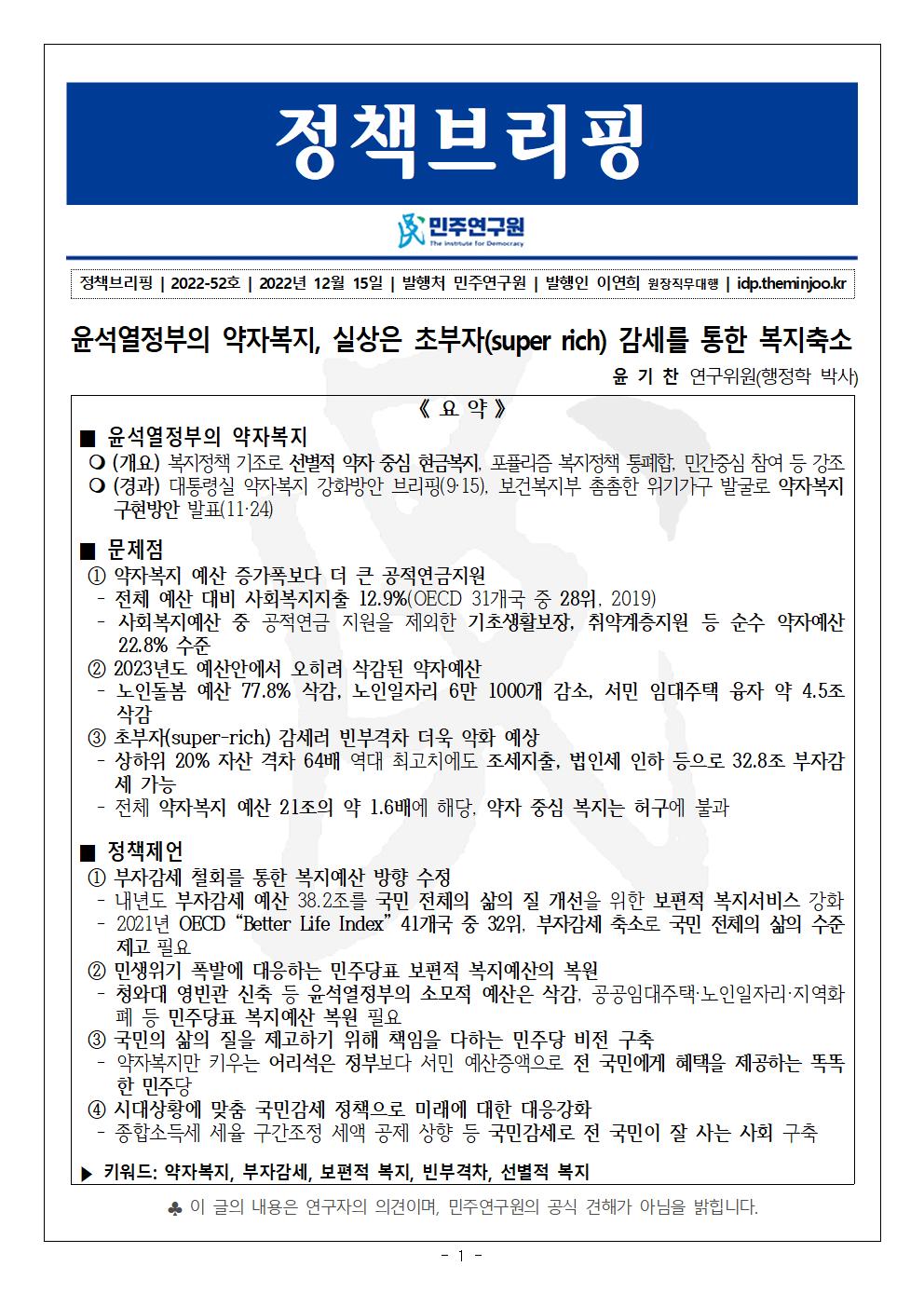 221215_민주연구원_정책브리핑_52호_윤석열정부의_약자복지,_실상은_초부자(super_rich)_감세를_통한_복지축소_윤기찬.pdf