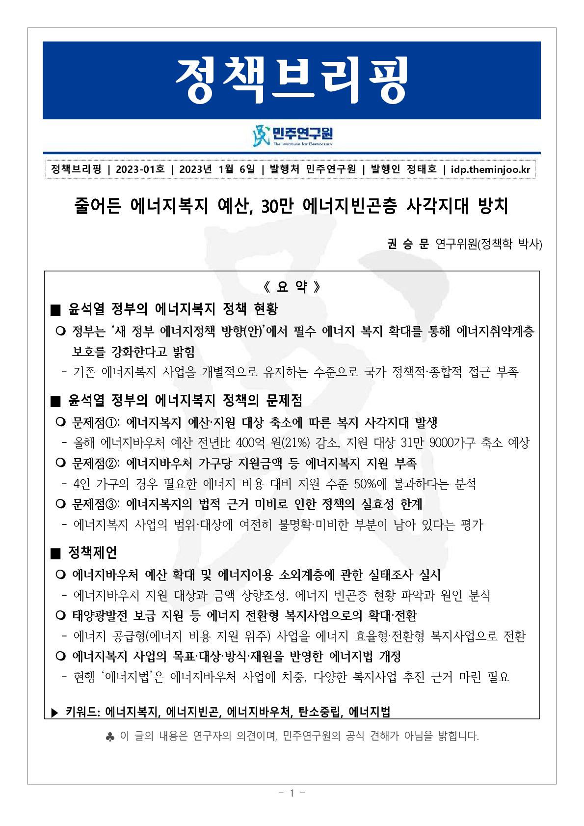 230106_민주연구원_정책브리핑_2023-01호_줄어든_에너지_복지_예산,_30만_에너지빈곤층_사각지대_방치_권승문_연구위원.pdf