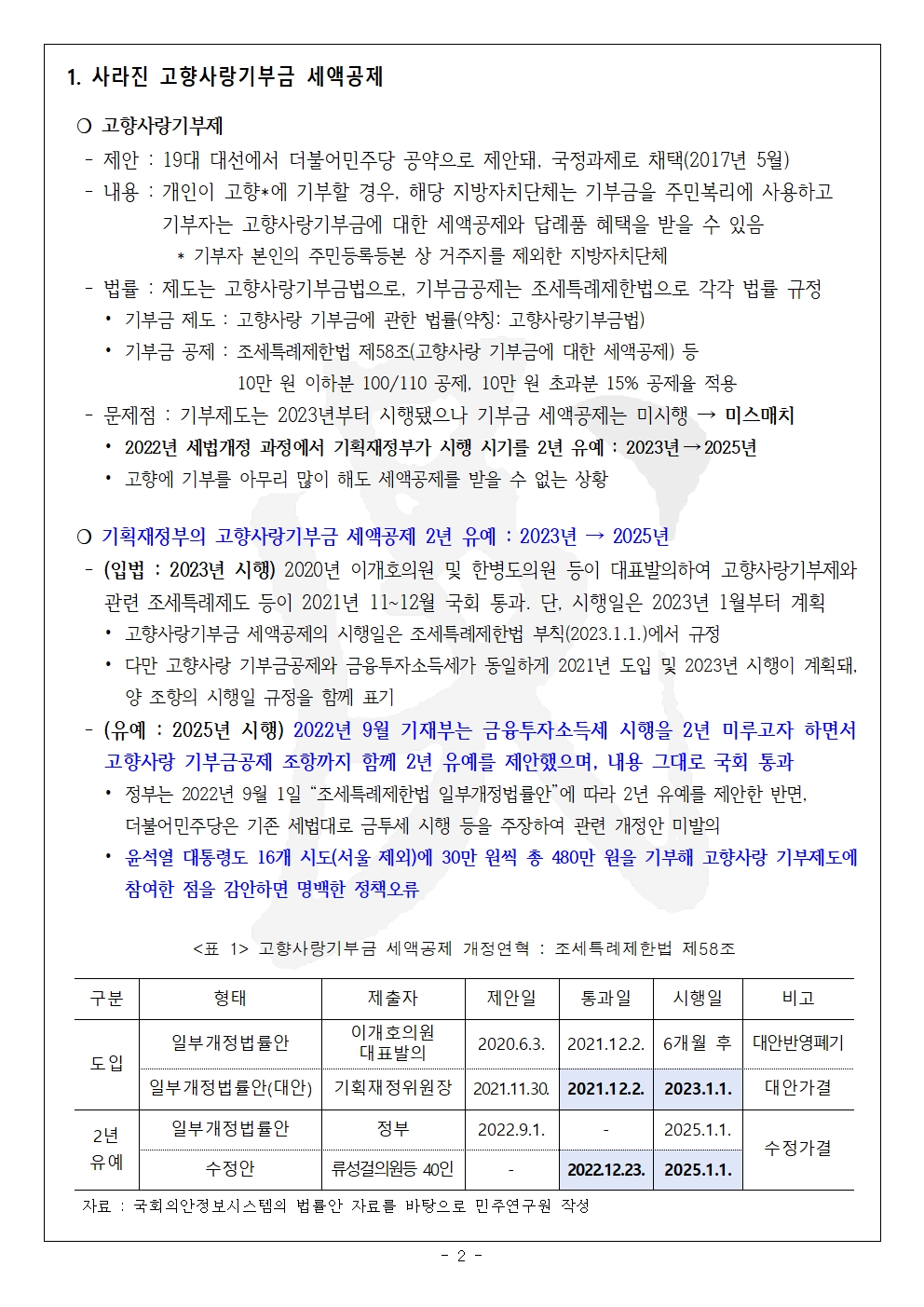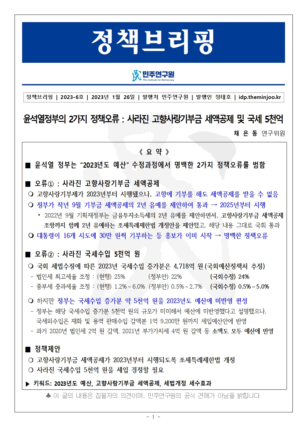230126_민주연구원_정책브리핑_6호_윤석열정부의_2가지_정책오류-사라진_고향사랑기부금_세액공제_및_국세_5천억.pdf
