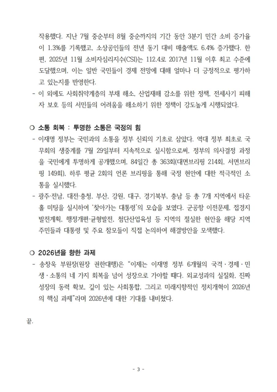 [보도자료] 정책브리핑 2025-11호 이재명 정부 6개월의 네 가지 회복 : 국격·경제·민생·소통 회복