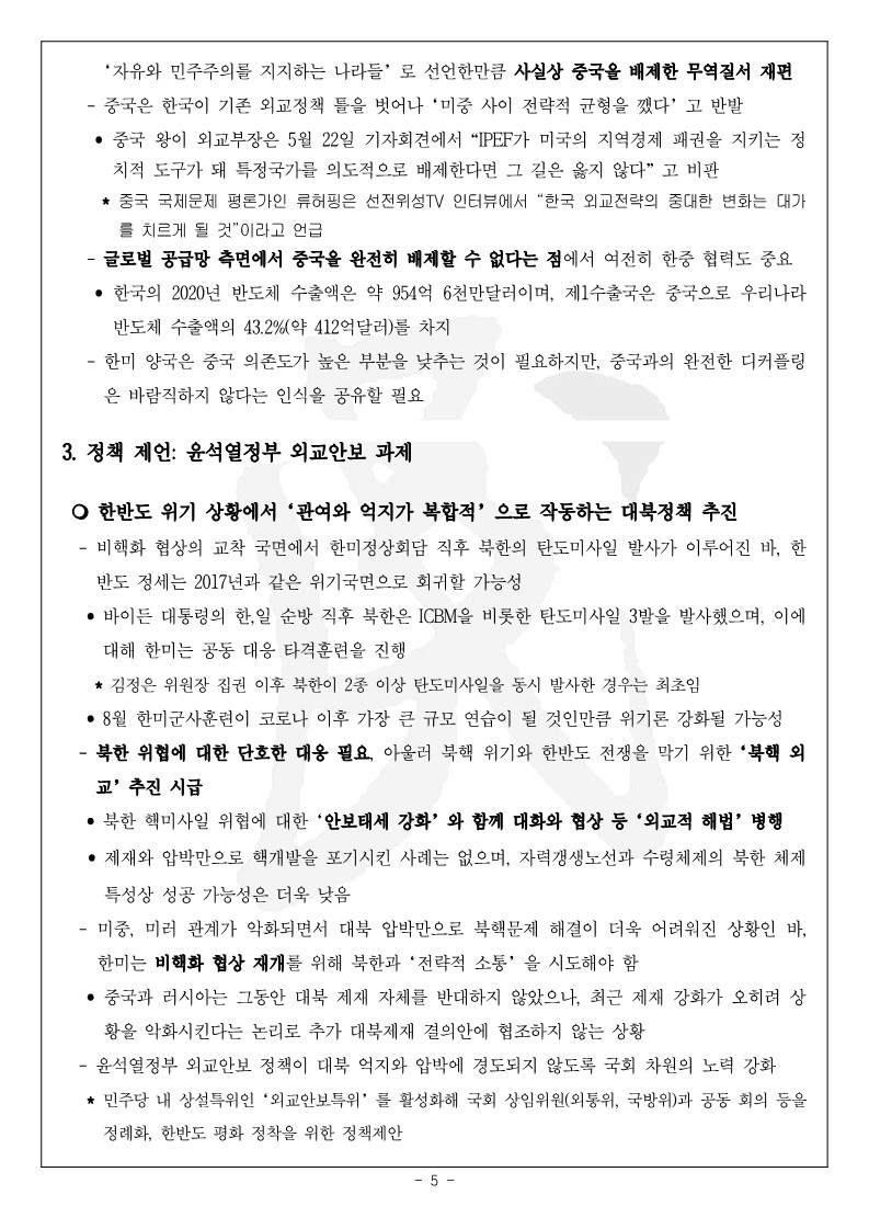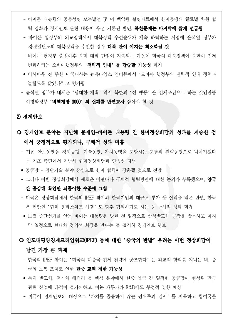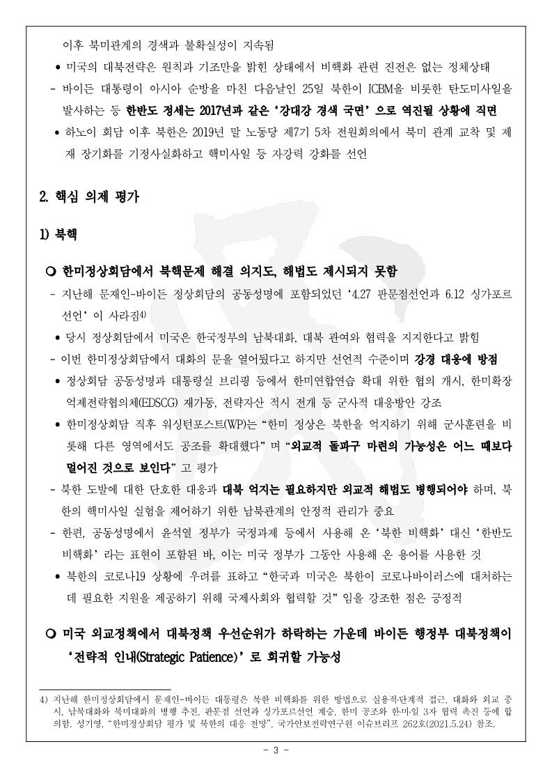 ‘외교 해법 없는’ 윤석열정부 외교안보정책을 우려한다 : 한미정상회담 핵심의제 평가와 과제