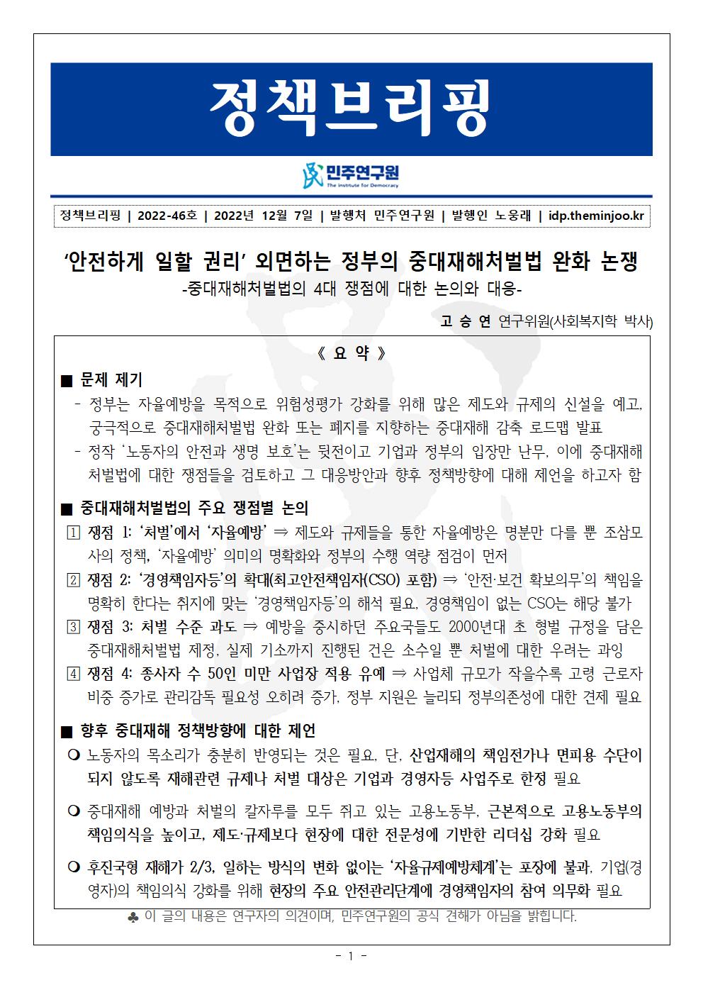 221207_민주연구원_정책브리핑_46호_안전하게_일할_권리_외면하는_정부의_중대재해처벌법_완화_논쟁_고승연.pdf